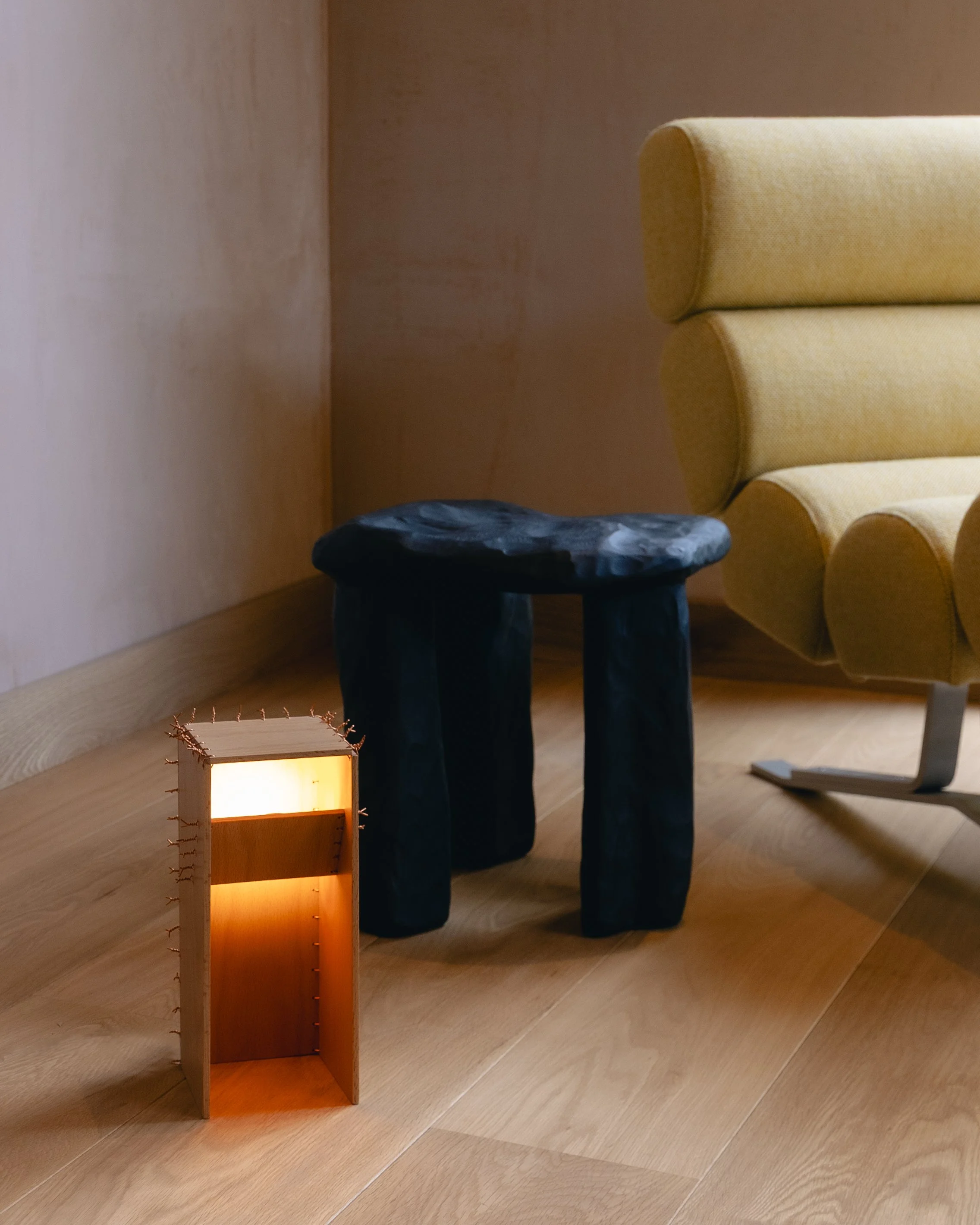Experimenting with the alternative tools and materials to create structures and objects, Robert has created a highly contemporary light design which emits an indirect ambient light which matches the objects sculptural form and casts a satisfying light across the desk, side-table or chosen living space.